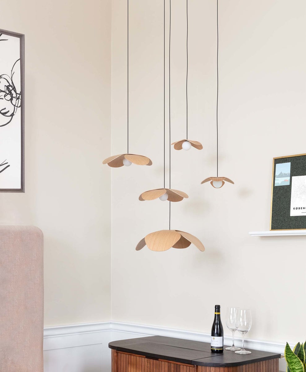 Kolmessa koossa ja puunsävyssä saatava Forget Me Not näyttää hyvältä yksin ja yhdessä. Rosette Mini Cluster -johtosarjalla saat tehtyä näistä valaisimista henkeäsalpaavan kokonaisuuden isoonkin tilaan.