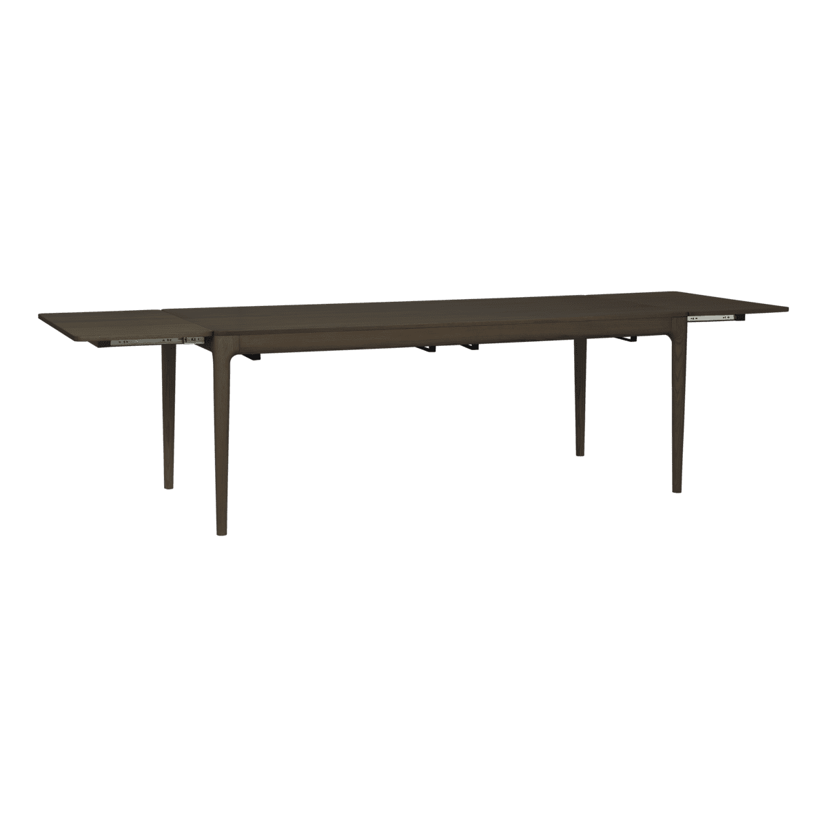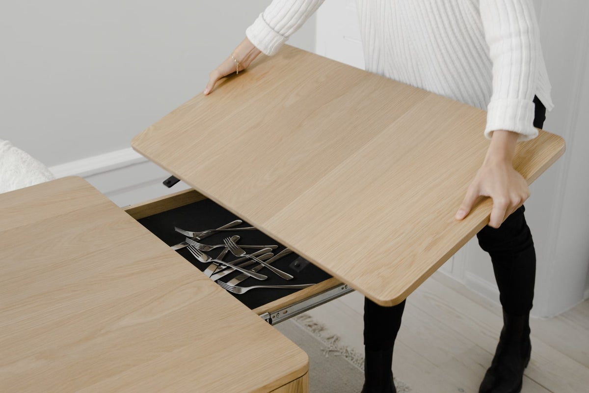 Vetolaatikot toimivat myös jatkolevyjen tukena, jolloin pöytä pysyy tukevana myös jatkettuna. Jatkopaloille on säilytyspaikat pöydän alla, josta ne on helppo ottaa käyttöön silloin, kun pöytätilaa tarvitaan lisää.
