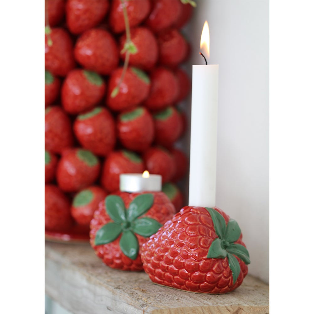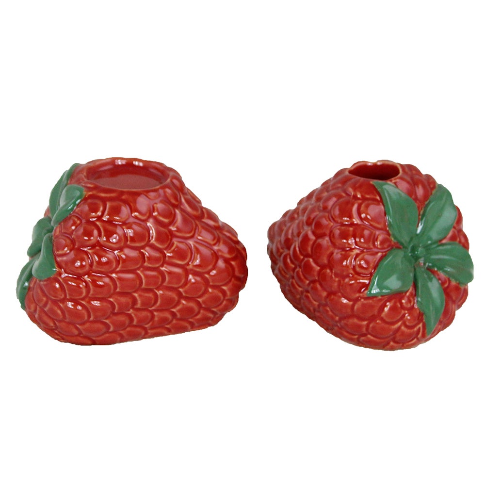 Kesäkattaukseen ja somistukseen hauskuutta tuovat vadelma-kynttilänjalat toimivat niin sisällä kuin ulkona. Settiin kuuluu yksi kynttilänjalka tuikulle ja yksi kruunukynttilälle.