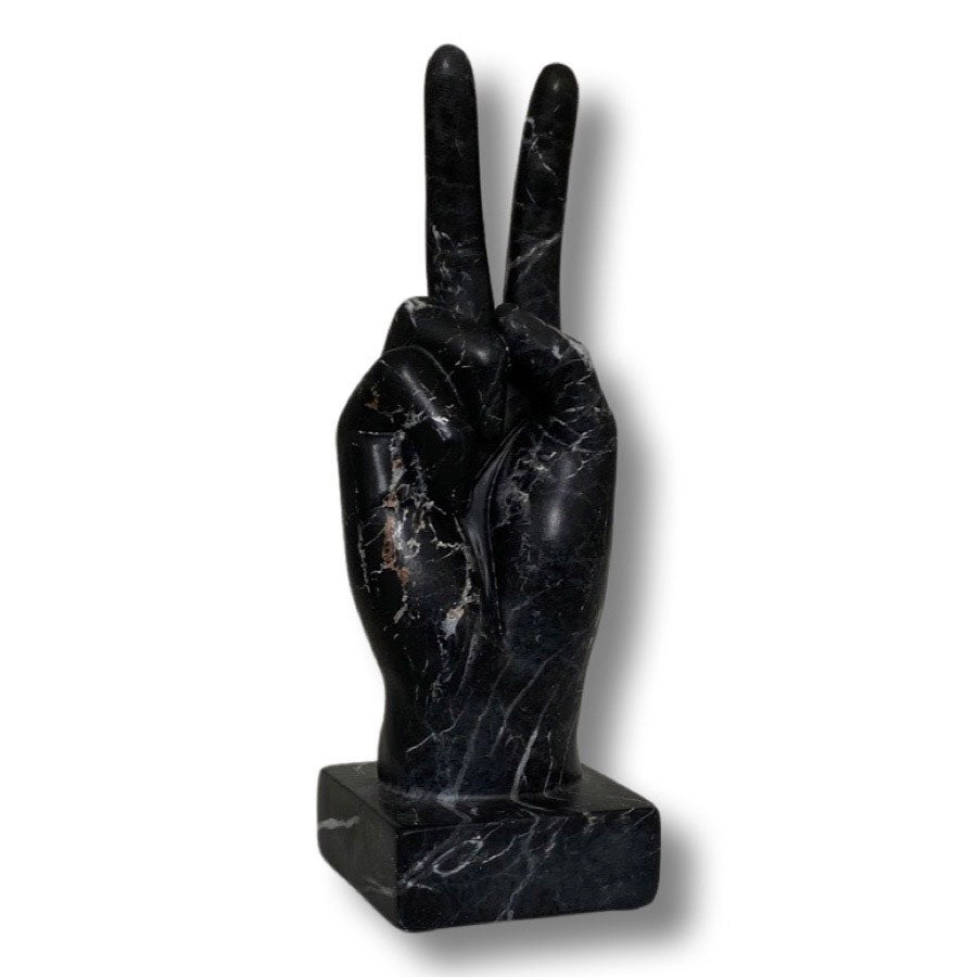 Klassiset mustat yksityiskohdat sisustuksessa kruunaavat kokonaisuuden. Tämä leikkisä, tuttua käsimerkkiä näyttävä patsas toimii monessa tilassa.