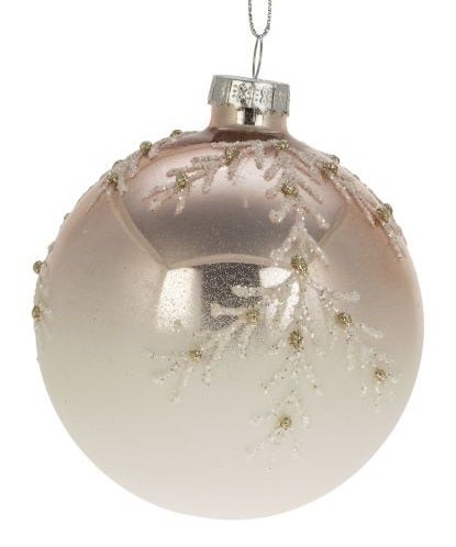Upea huurteinen, liukuvärjätty lasipallo kimaltelevilla lumihiutaleilla.