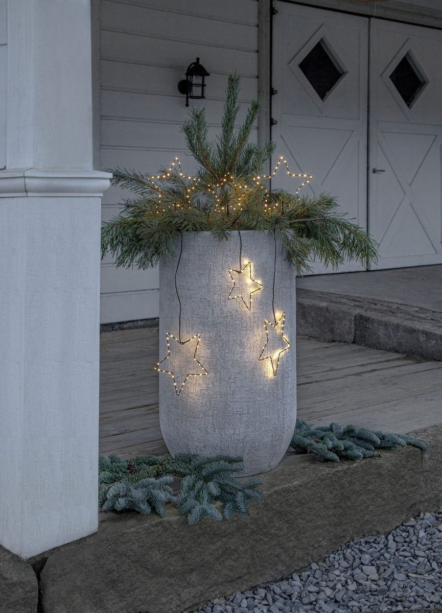 Ulkovalokoriste näyttää kauniilta talvisten kukka-asetelmien kanssa pihan sisustuksen katseenvangitsijana.