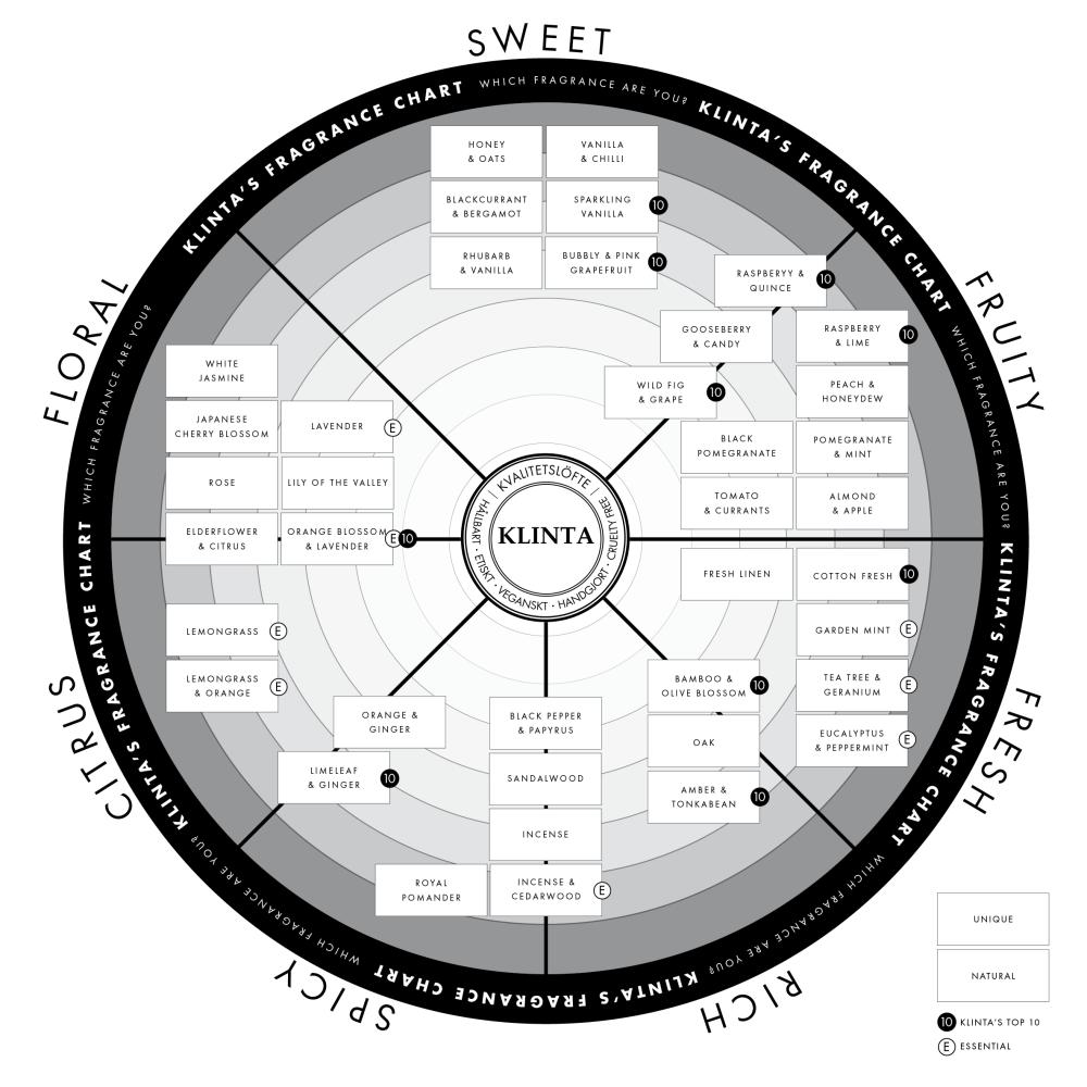 Klintan valikoimassa olevat tuoksut ovat tarkoin valikoituja ja valikoimasta löytyy monia jännittäviä tuoksuja, joiden yhdistelmät ovat hienostuneita, kepeitä ja ilmavia.