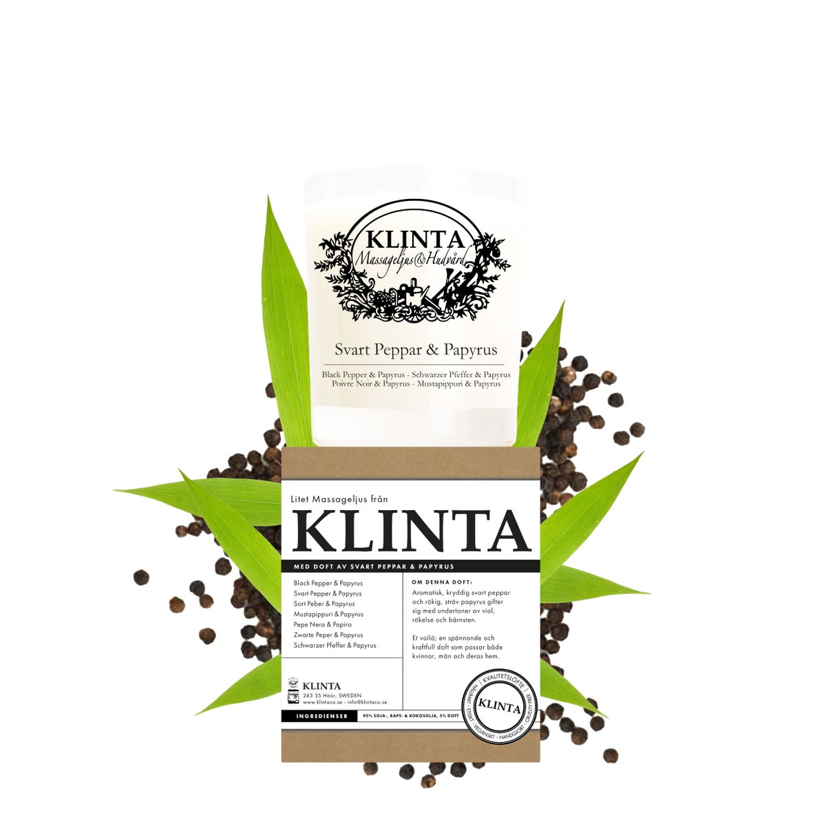 Klintan hierontakynttilät ovat täysin orgaanisia, eivätkä ne sisällä steariinia, parafiinia, parabeenejä, mineraaliöljyjä, väriaineita tai muita keinotekoisia ainesosia. Tästä syystä kynttilän vahaa on turvallinen käyttää iholla eikä se polta, vaan tuntuu rentouttavan lämpimältä. Kynttilät sisältävät paljon ihoa pehmentäviä E-vitamiineja.