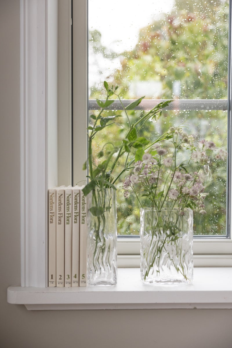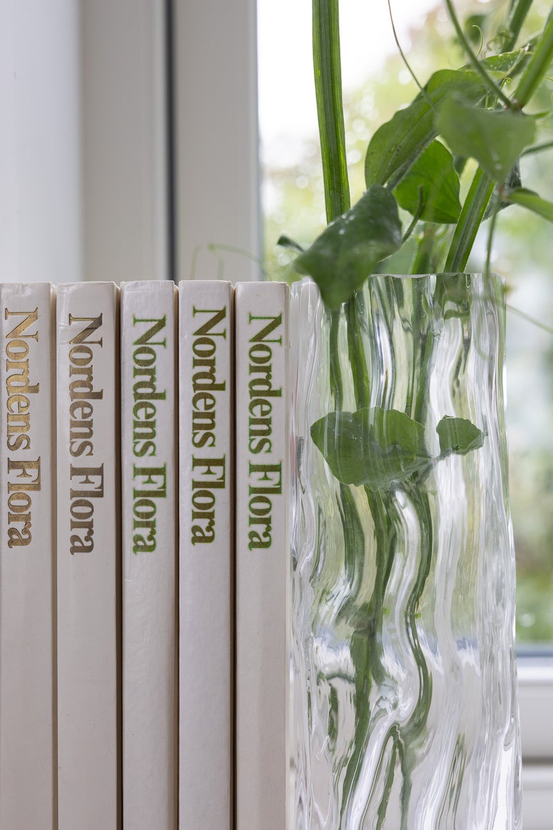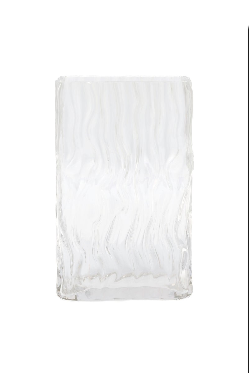 Luonnosta inspiraationsa ammentava nelikulmainen lasimaljakko, jonka aaltoileva muotoilu tuo mieleen veden liikkeet. Täytä maljakko vuodenajan kukilla ja oksilla.