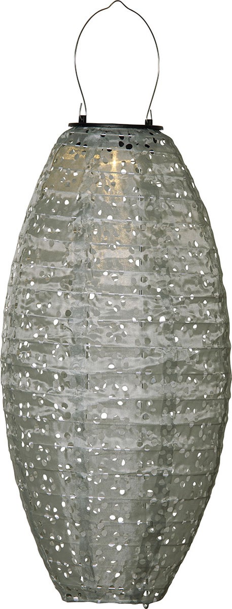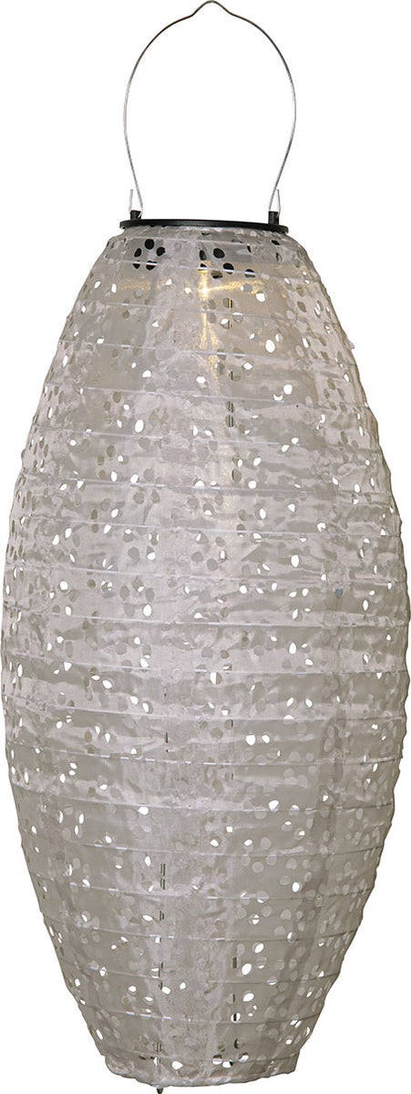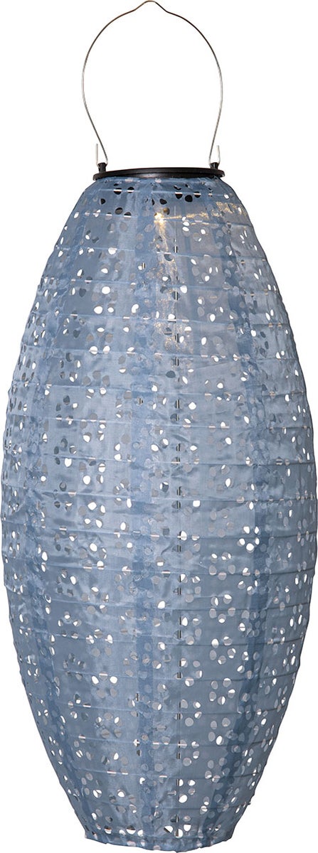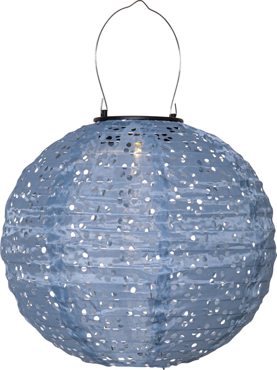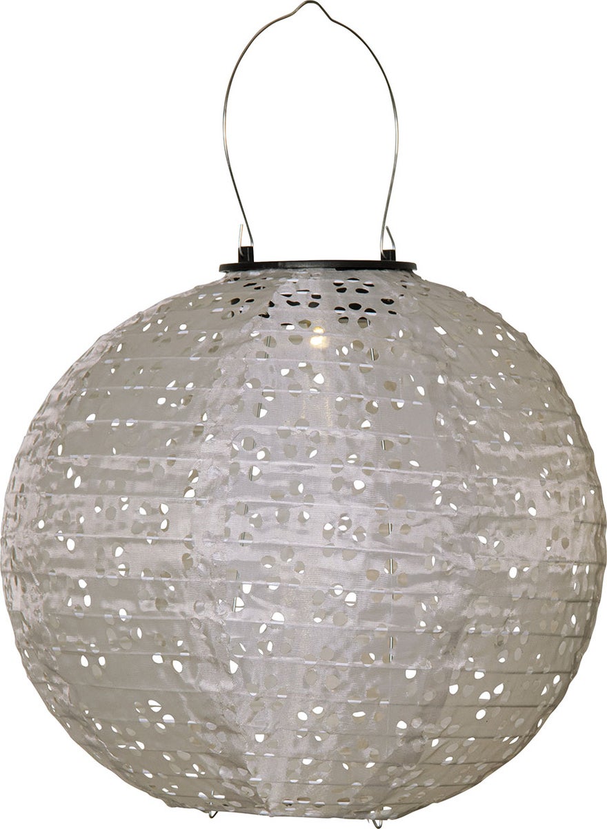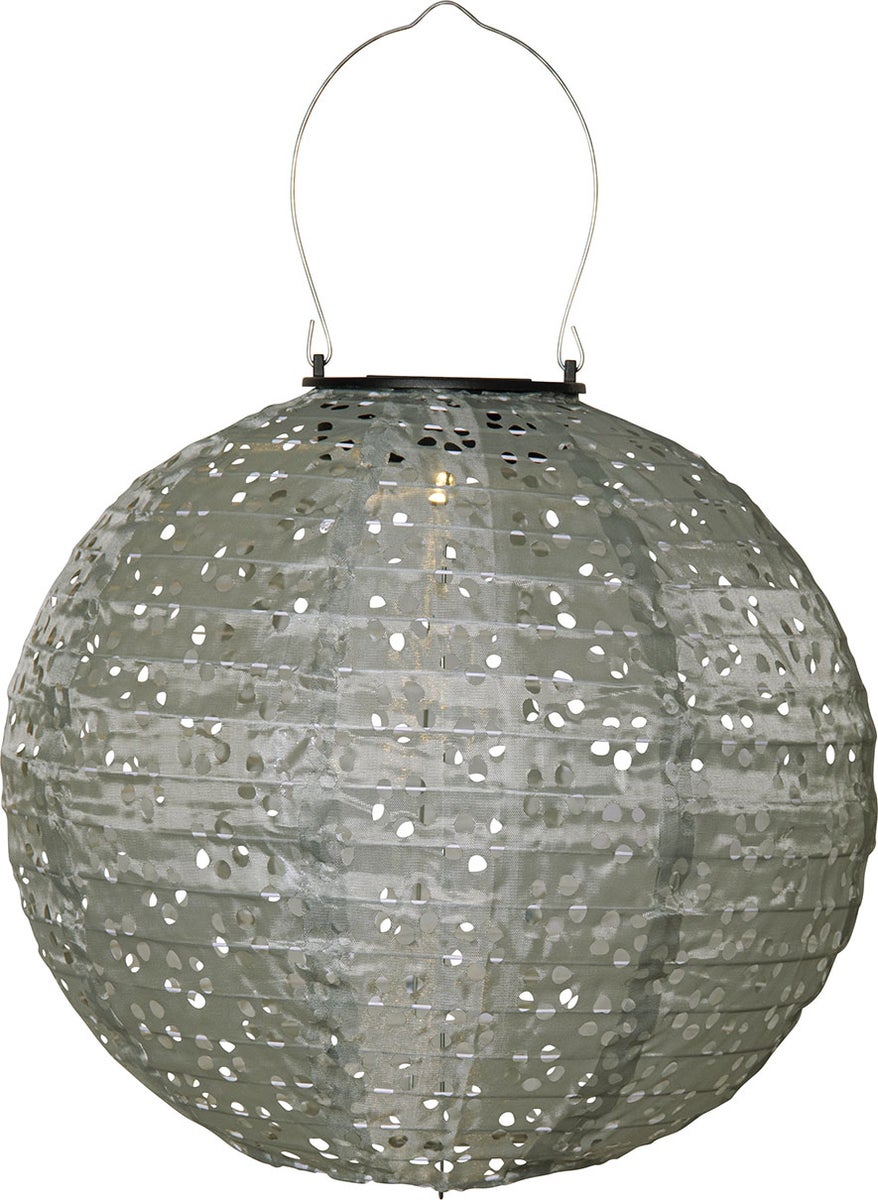 Aurinkokennolla toimiva koristelyhty, jonka kaunis reikäkuviointi luo hienoja varjoja hämärällä.