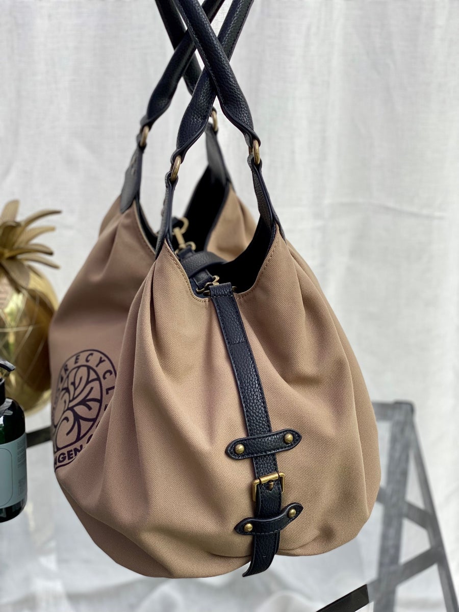 Kestävästi kierrätysmateriaalista valmistettu laukku ei ole ainoastaan ympäristöystävällinen, vaan myös tyylikäs. Mukana tulee pieni hihna, jolla voit kaventaa yläosaa kiinnittämällä sen sivuilla olevaan D-renkaaseen.