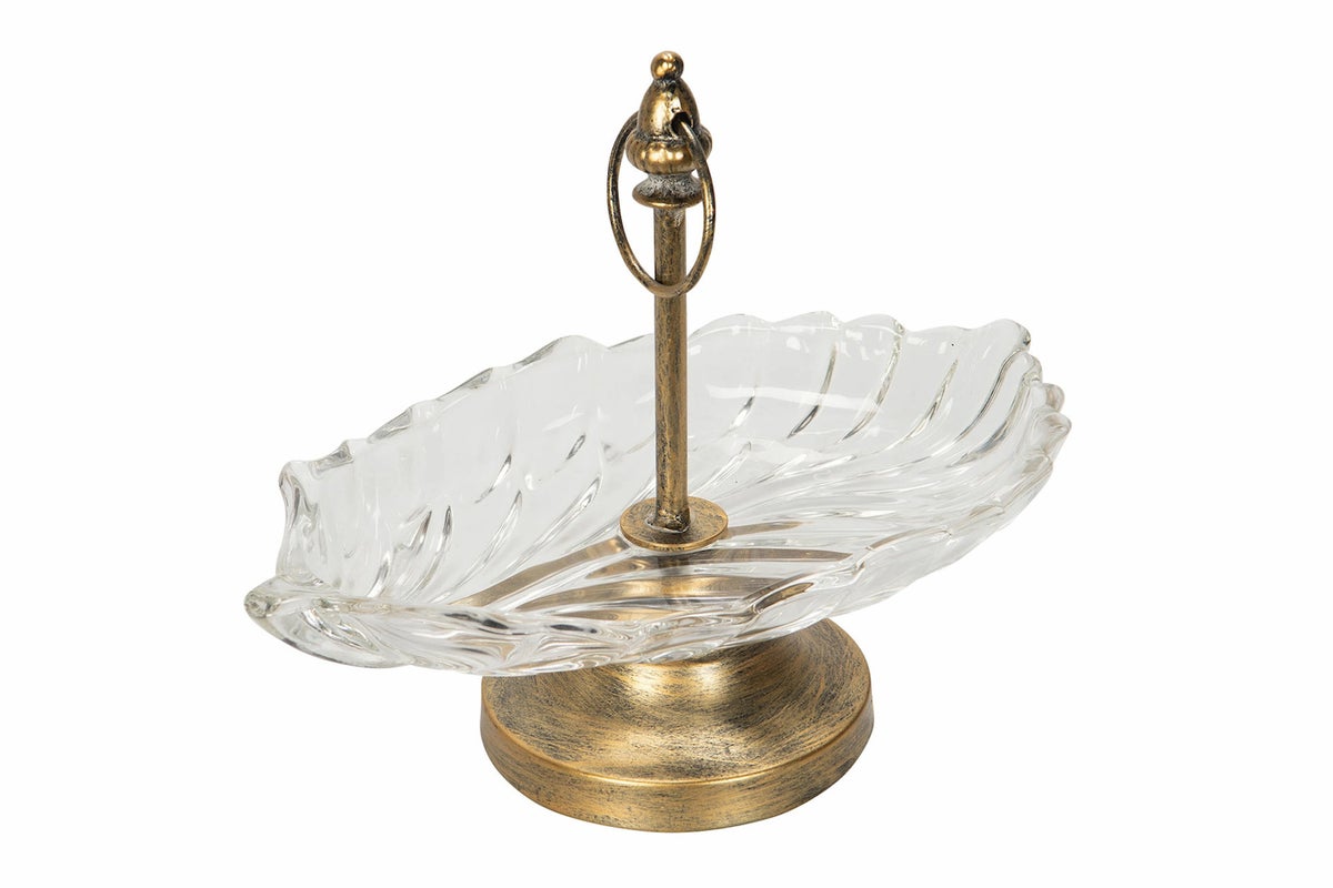 Koristeellinen kulhomainen tarjotin jalalla, jossa on kahva yläosassa. Sopii erinomaisesti karkkien, pähkinöiden tai muiden herkkujen tarjoiluun — tai vaikka korujen säilytykseen!