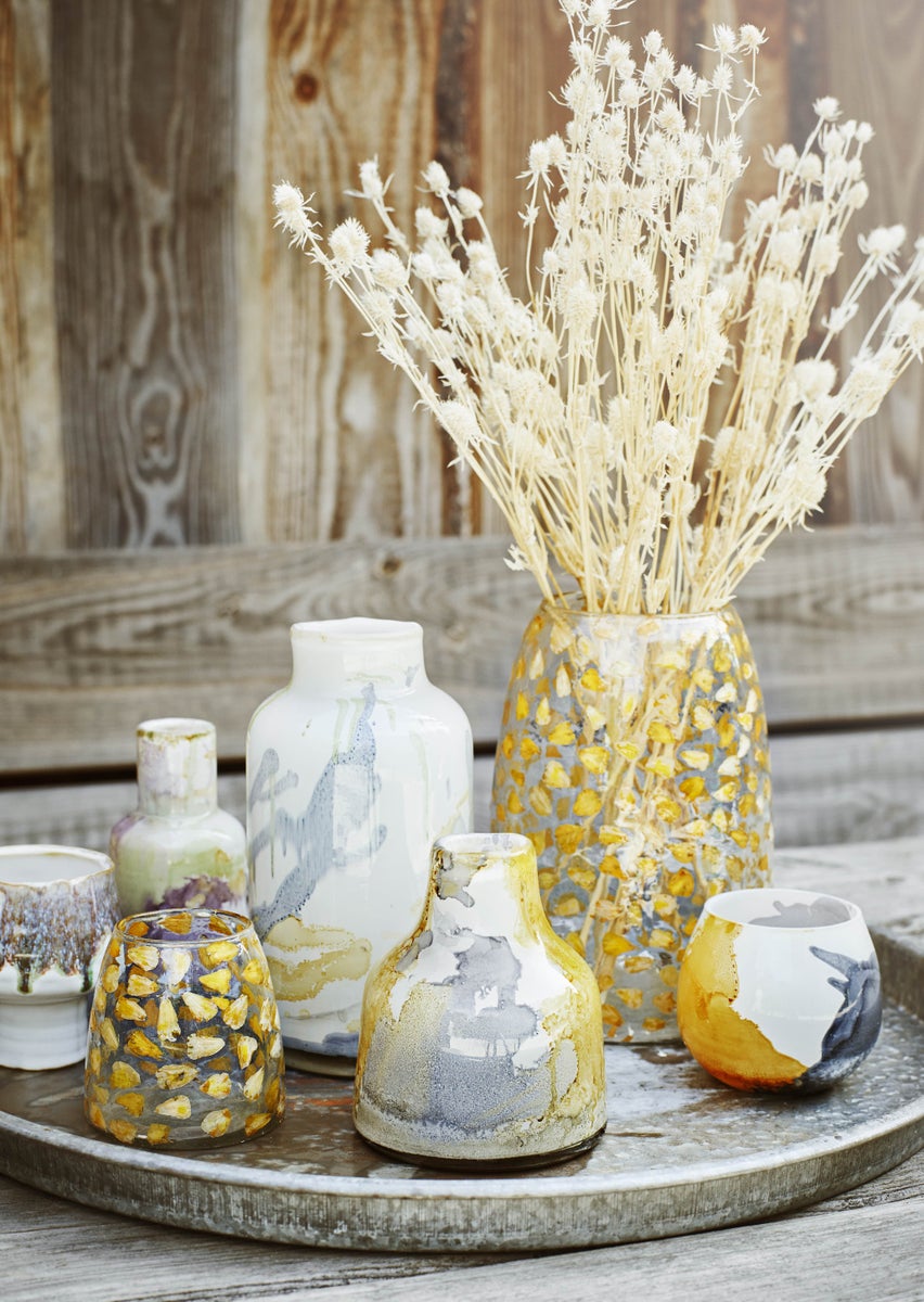 Reaktiivinen maali luo ainutlaatuisia kuvioita ja värikoostumuksia jokaiseen tuikkukuppiin.